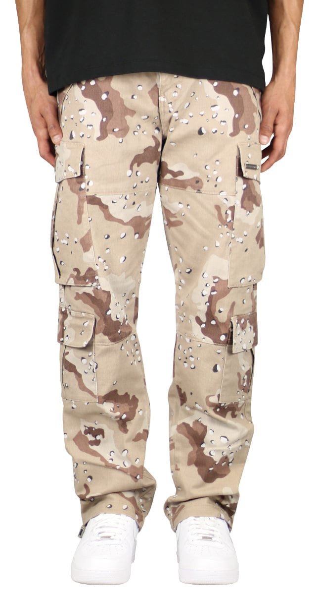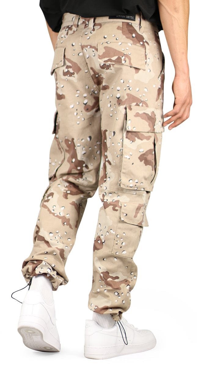 These cargo pants offer an oversized fit, complete with a traditional jeans button and belt loops for a classic look. They feature eight utility pockets for maximum storage and adjustable bungee cords at the ankles for a customizable fit.