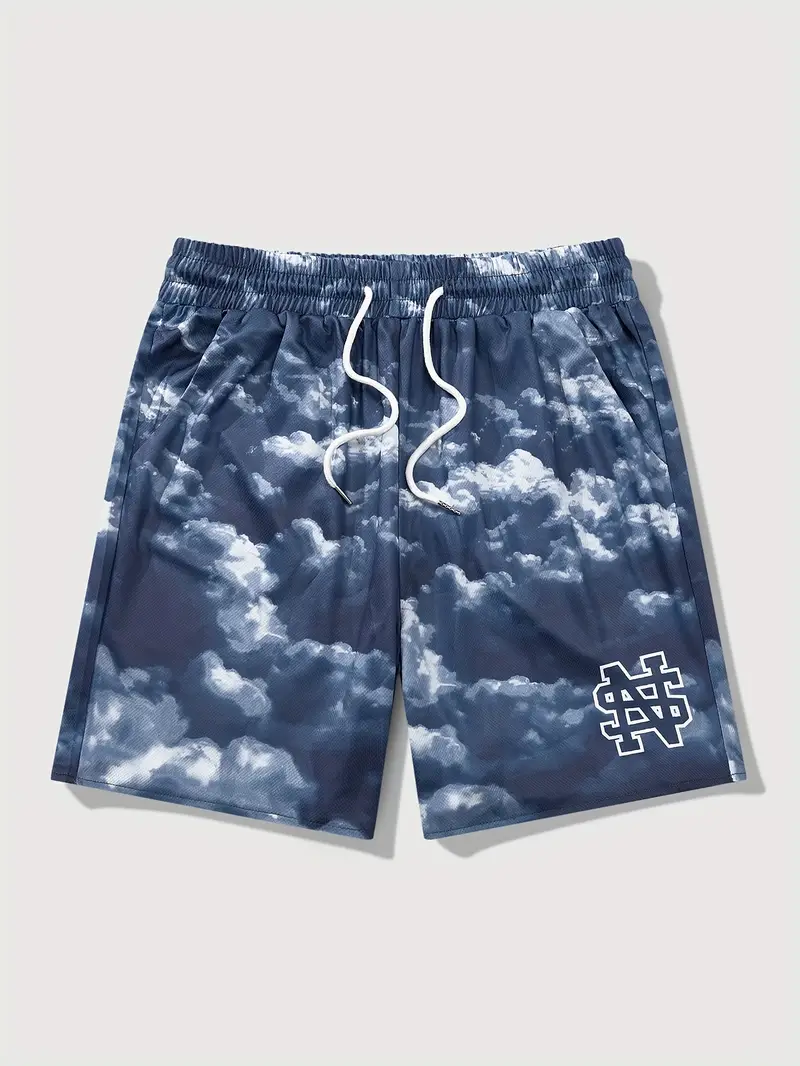 Men’S Casual Athletic Shorts – Blue Tie-Dye Sky Design with Red M” Logo, Loose Fit, Lightweight Polyester